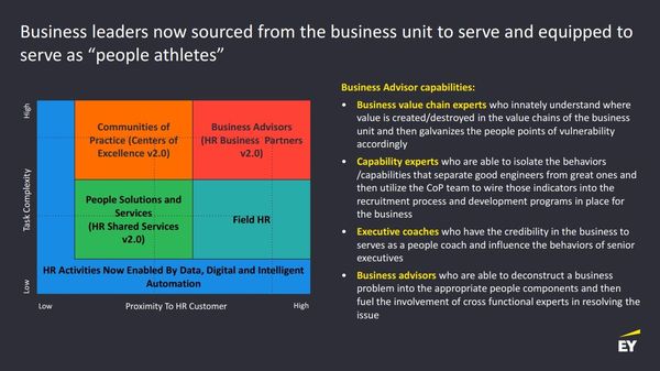 太字部分を見ていただくとわかるように、いずれのケイパビリティにおいてもビジネスの深い理解や関係性が前提となっています。(HR) Business Advisorは、そのビジネスの最高責任者と同等程度の深い見識を持ち、HRの専門家としてビジネスをドライブするために必要な助言や施策の実施を遂行するという極めて困難な役割である、といえるでしょう。従来のHRBPですらハードルが高いのに、より高いレベルでビジネスの理解が求められるとなると、日系企業にとって、やはりこの領域に適切な人材を配置できるかどうかが、最新のHR TOMに進化することの成否の分水嶺になるのではないでしょうか。