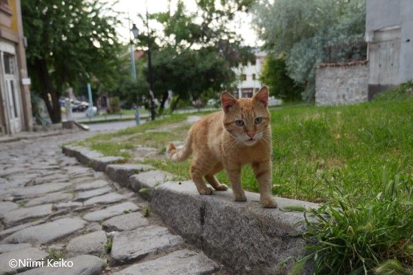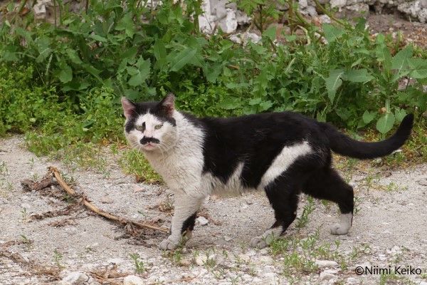 このあたりのボス猫でしょうか。「見かけねぇ顔だな」と、一瞬足を止めてこちらをにらみました。強面の表情をしているのに顔の柄がキュートで、思わず笑ってしまいました。