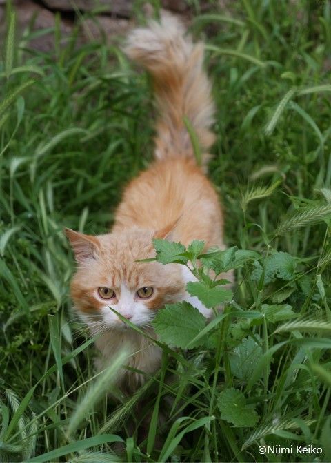 草むらの中で用を足したのち、シッポを高く持ち上げました。単なるくせなのか、自らの存在をアピールするためかもしれません。