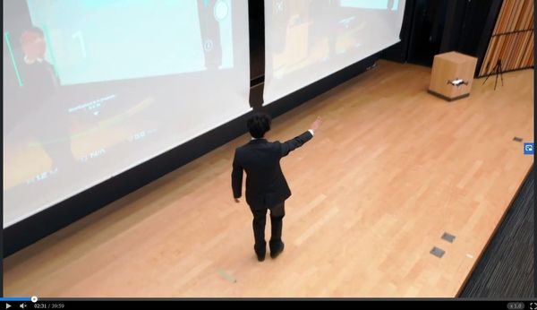 この講義、大学キャンパスのホールでドローンを使って空撮した動画なのです。自動追尾機能がついてるので、ホール内を歩き回る先生を追いかけて映像を撮ってくれます(記事冒頭の写真)。