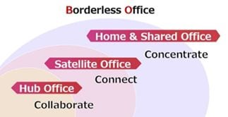 「Borderless Office」では、オフィスの在り方を見直し、従来からの固定的な働き方の概念を変化させる。働く場所を、業務内容に合わせて自宅やハブオフィス、サテライトオフィスなどから自由に選択できるようにする。