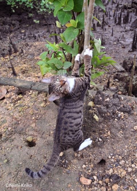 名前はサス。生後6カ月くらいのオスです。この家にもらわれてきたばかりの子猫の頃、初めて蟹を見て追いかけると、蟹がこの木の下にある穴に入り込みました。写真の下の方、猫の両脇に黒い部分が2つ見えますが、それが蟹の穴です。