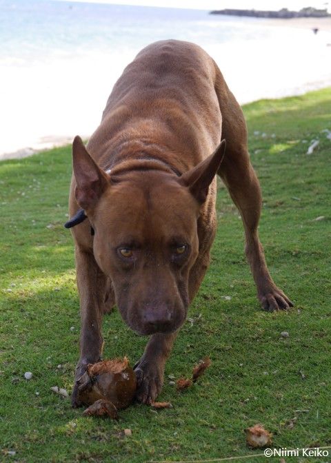 誰が教えたわけでもない、ベン自身が考えた遊びだそうです。サーフィンをする飼い主を退屈して待っているとき、落ちたココナッツを見つけ、そのうち中のジュースを飲むことを覚えました。その後、ボール遊びができることに気がつき、遊びが発展し続けます。「ベンの一番の特技は、人のよさそうな人を見抜く眼力だね」と言われ、「降参だ」と思いました。