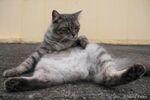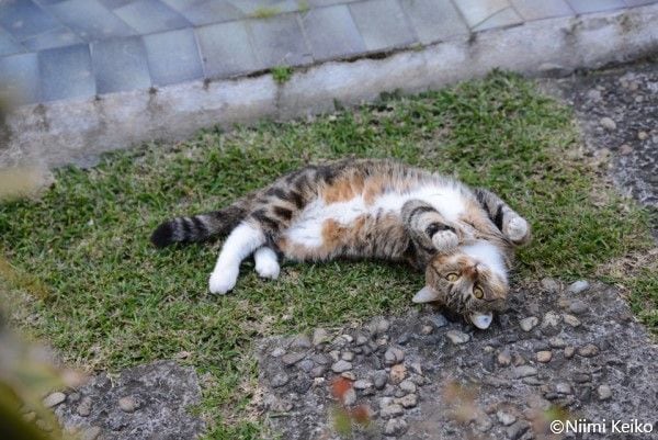 この猫は芝生の上でゴロンゴロンしていたのですが、寝返ったときに砂利道まで飛び出してしまいました。