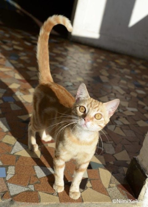 夕方近く、強い西日が当たる家の玄関に、赤いクラシック・タビーの猫がいました。毛並みが、玄関ポーチのタイル柄とあいまってきれいです。ニューカレドニアの光と影を表現した思い出の1枚となりました。