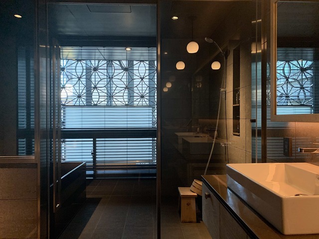 翌朝、オフィスビル群を照らしゆく朝日と旅館外観の麻の葉くずしの模様が作り出す陰影の美しさに心を奪われた。ゆったりとした空間と太陽の光が目覚めを気持ちよくさせる。