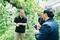 ワイナリーツアーで自社農園のブドウを紹介する赤尾工場長(左)