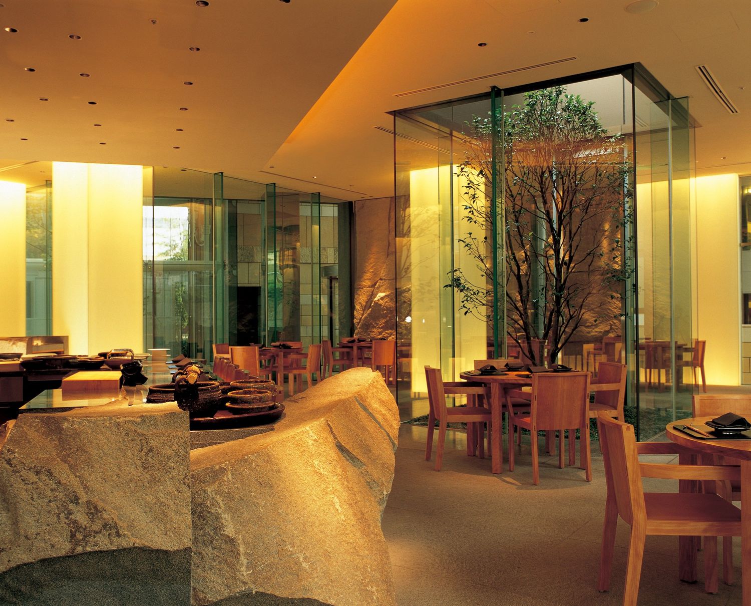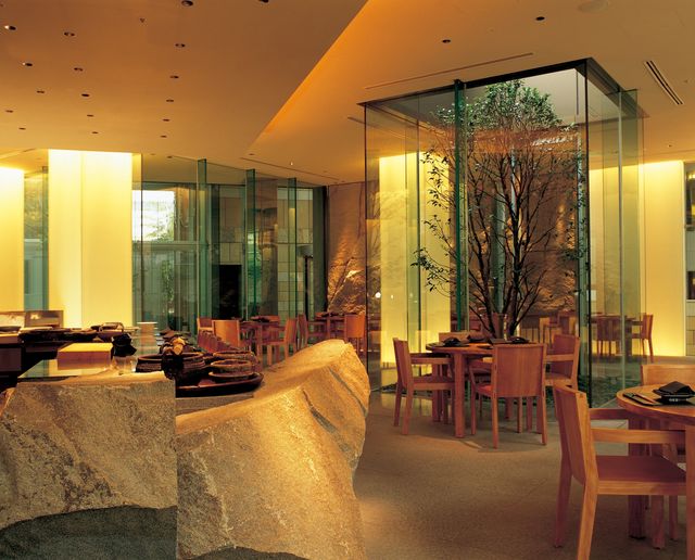 石とガラスを生かしたインテリアがモダンな日本料理「旬房」。ディナーは1万3000円~(税サ別)