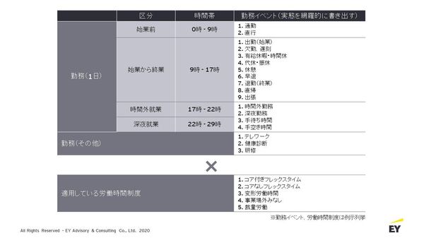 アプローチとしては、最初に1日を就業管理上の時間帯で区分し、それぞれで発生しうる勤務イベントを洗い出します。勤務イベントは自社の「就業規則」や「労使協定」で明文化されているものから現場の慣行まで、できるだけ網羅的に書き出します。