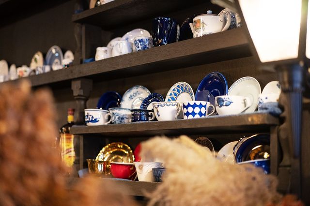 濃い青色や花柄が目を惹くカップ。珍しいものを集めていって飾るようになった。