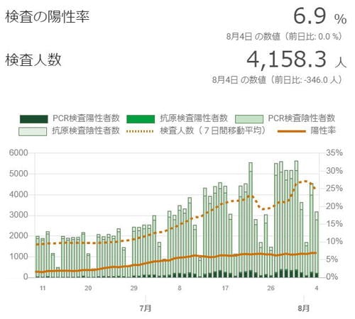 東京では6月から新しい検査キットで感度が上がったので、微量のウイルスも検出するようになり、陽性率が上がったが、7月は図1のように6.5%前後でほぼ安定している。