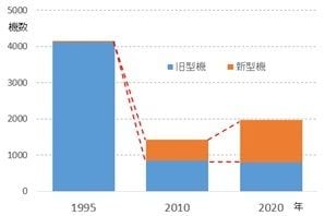中国空軍保有機数のうち新型・旧式戦闘機数の内訳と変化