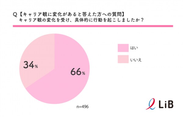 さらに、「キャリア観の変化により、具体的な行動を起こしたか」と聞いたところ、「実際に行動を起こした」が66%となり、過半数を大きく超えた。具体的には、「自身の価値観や強みについて、考え始めた」、「転職活動を始めた」、「資格取得に向けた勉強を始めた」などの声があがった。