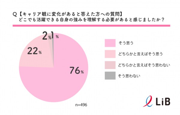 また、「どこでも活かせる、自身の強みを理解する必要はあると思うか」と尋ねた。その結果、「思う」が76%、「どちらかと言えば思う」が22%で、合計は98%に。ほぼ全ての回答者が、業種を超えて活かせる「自身の強みの理解を深めること」の重要性を意識していた。