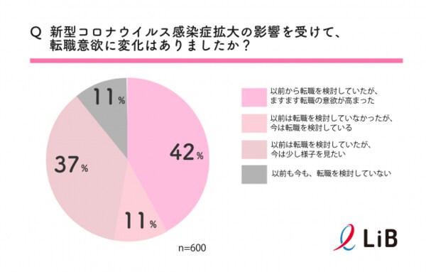最後に、新型コロナ感染症拡大の影響により、「転職意欲の変化」があるかについて聞いた。「ますます意欲が高まった」(42%)、「転職意欲が高まった」(11%)の合計は53%となり、半数以上の女性が意欲に変化があったようだ。検討しているという女性からは、「リモートワークや在宅勤務といった柔軟な働き方ができる企業に転職したい」、「テレワークが許されれば、地方都市に住みながら東京の企業で働けそう」などの声も聞かれた。