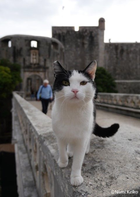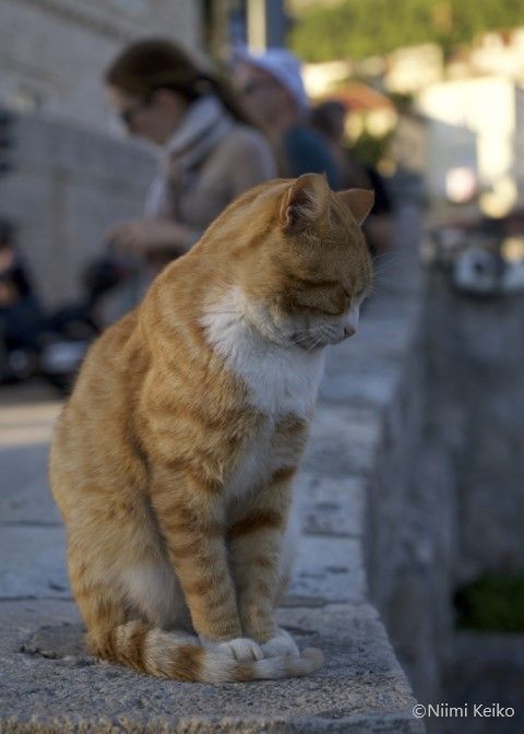 ピレ門の周辺は、団体観光客の集合場所に指定されることが多く、地元の人たちもよく待ち合わせ場所にしているので、一日中にぎやかで、人通りが絶えません。そのため、人に撫でてもらいたい猫たちが集まってきます。
