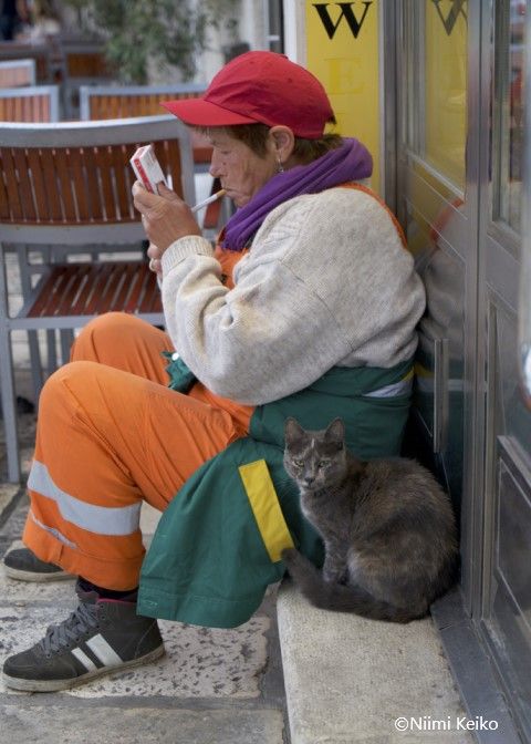 休憩時間のようです。猫はその人に寄り添いました。「食べ物を与えたことは一度もないよ。ただの友だち。お互いに顔を見れば安心するから。それだけ」。