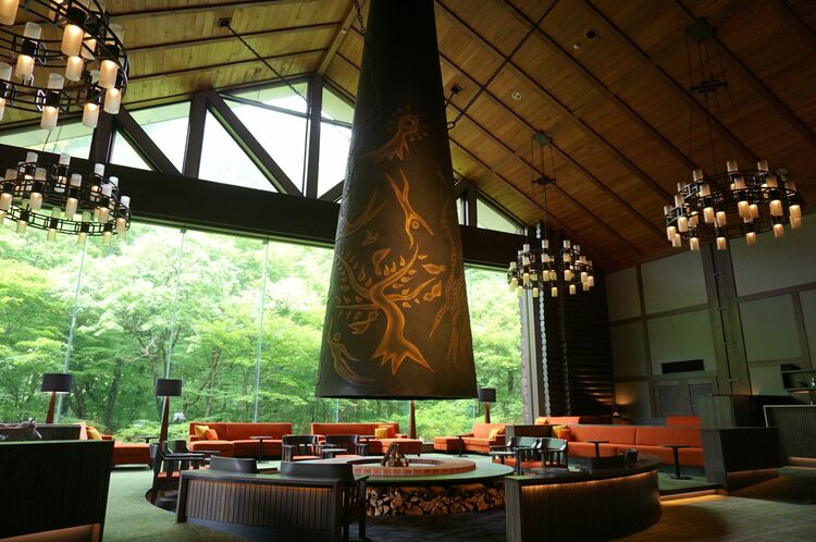 ロビーの暖炉『森の神話』は、奥入瀬を愛した芸術家の岡本太郎さんが1991年、80歳で制作。遺作である立体彫刻の暖炉『河神(かしん)』も館内にある