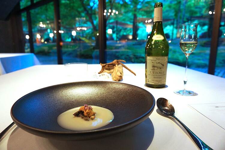 郷土料理の潮汁「いちご煮」が、濃厚ソース仕立てのフレンチに。白ワインと相性がいい。