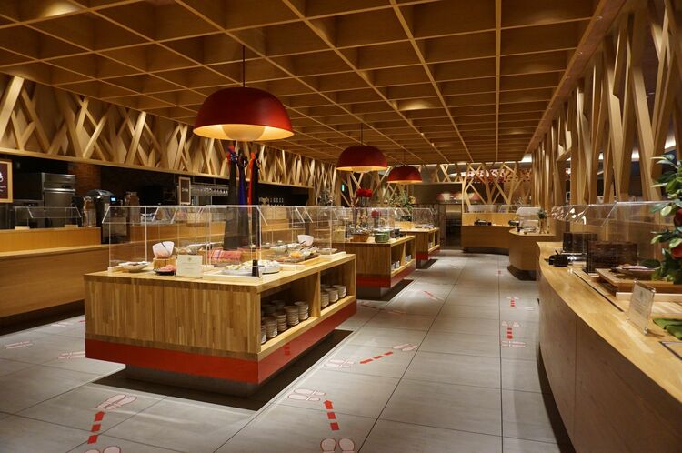 ソーシャルディスタンスの案内にもデザイン性を感じたビュッフェレストラン「青森りんごキッチン」。