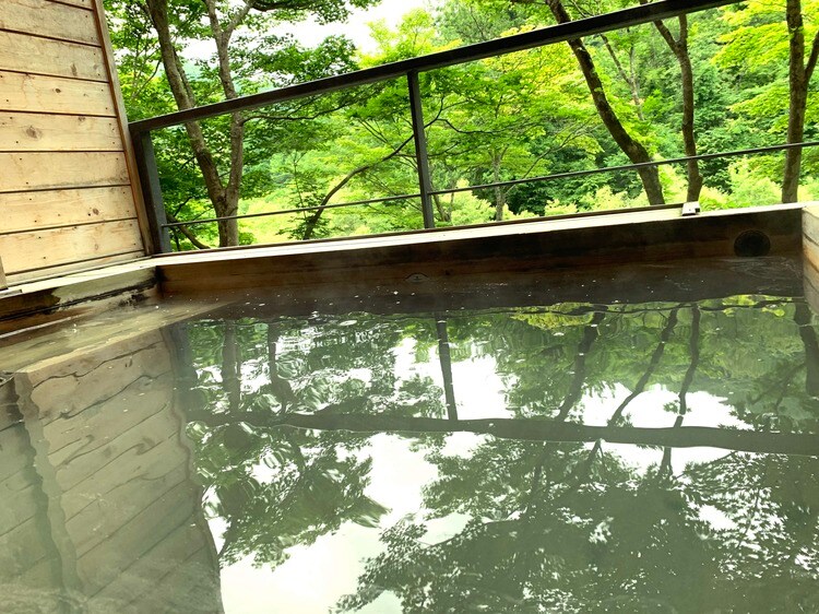 奥入瀬は温泉も魅力だ。眼下に渓流が広がる「渓流露天風呂」は開放感抜群。八甲田山から湧き出る単純温泉が注がれ、硫黄の香りが漂う。大浴場はまだ不安という方は温泉付きの客室滞在はいかがだろう。中でも、そばまで渓流が流れる客室「渓流和室 露天風呂テラス付」がオススメだ。木造りの広めの浴槽にゆっくり浸かり独占。温泉に身を委ねることで日頃のストレスが軽減されるはずだ。