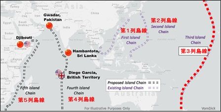 中国共産党指導部や人民解放軍が想定する中国の勢力圏は拡大を続けている。元米海軍士官で戦略研究家であるウィルソン・ヴォーンディック氏は、中国の列島線構想がインド洋の「第4列島線」や「第5列島線」にまで拡大していると分析している(出典:「増えていく列島線と第3列島線について」 海上自衛隊幹部学校 防衛戦略教育研究部 戦略研究室 山下奈々、リンク:https://www.mod.go.jp/msdf/navcol/SSG/topics-column/col-142.html)