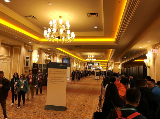 CES 2020開催日の朝、基調講演が行われるベネチアンホテルのボールルームへの長い行列が続く。会場に入れる保証のない行列に並ぶのは毎年の風物詩だ(筆者撮影)