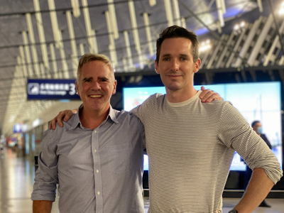 シドニーに向けて出国する際のビル・バートルズ記者(右)とマイケル・スミス記者(左)(ビル・バートルズ記者のツイッターより)