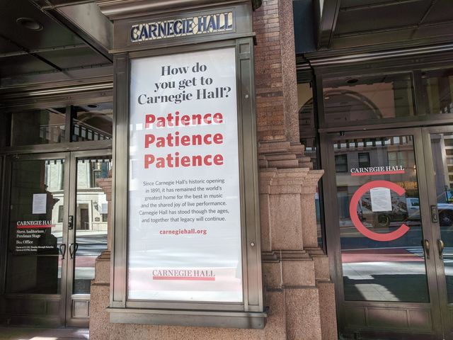 カーネギーホールに張り出されたポスターにはPatience(忍耐)の文字。パーフォーマーもオーデイエンスも再開が待ち遠しい