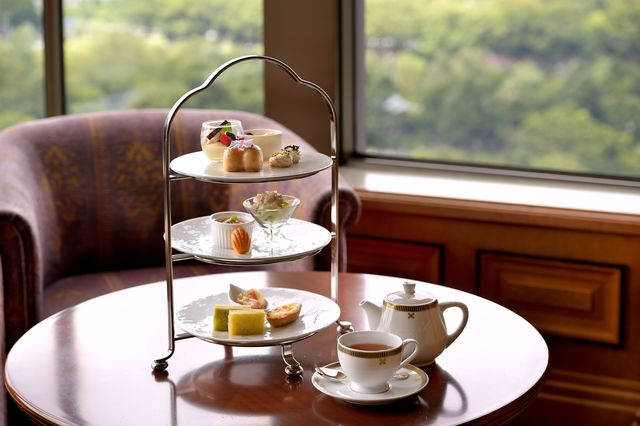 イギリスのインテリアデザイナー、ジュリアン・リード氏が設計した「インペリアルラウンジ アクア」の店内は、ウッディで落ち着いた雰囲気。窓の外には日比谷公園の緑が広がる。ラウンジの英国アフタヌーンティーを部屋でゆったりと楽しめる宿泊プランも発売中