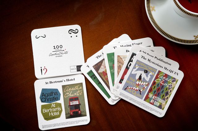 アガサ・クリスティーの小説の表紙をデザインモチーフとした、オリジナルのコースター。10月31日までの期間中に「アガサ・クリスティーの世界を味わう 英国アフタヌーンティー」を注文すると、1人につき1枚プレゼントされる