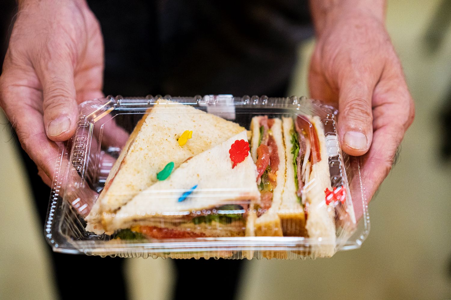 柔らかな肉とトマトの酸味、オニオンの甘みが絶妙なローストビーフサンド。こちらはテイクアウト仕様。