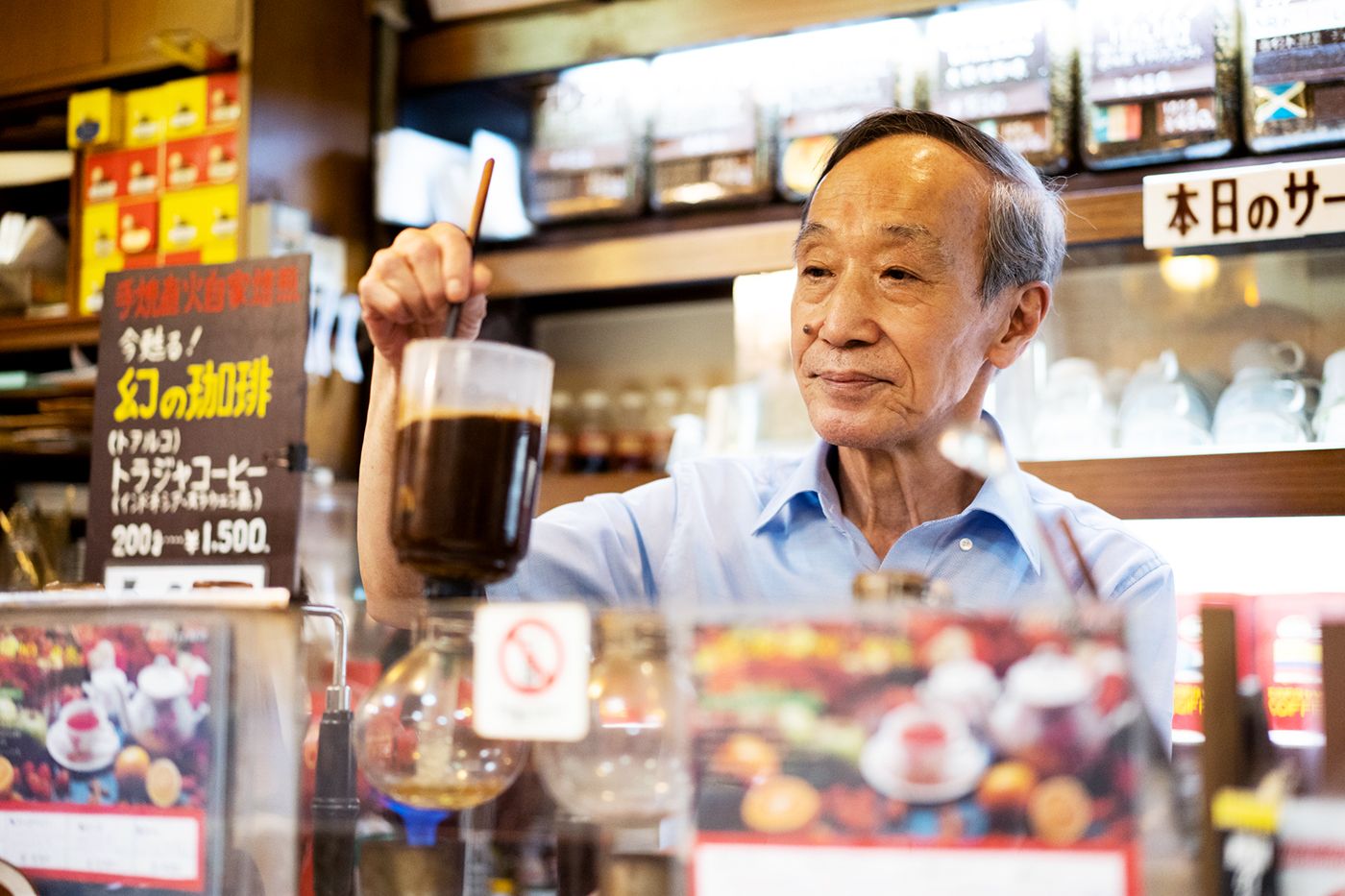 注文が入るたびに一杯一杯丁寧にサイフォンで淹れられる珈琲。珈琲を淹れるのにサイフォンを利用しているのは、時代的な背景もあるがパフォーマンスとして華やかな見た目も決め手だったそう。珈琲へのこだわりや情熱が今も衰えていないことは、カウンター席に掲げられた「第86回珍品コーヒーフェア」という貼り紙からもわかる。