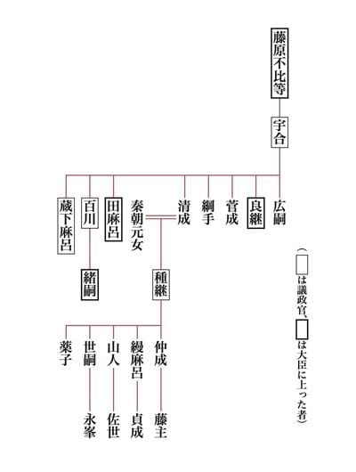 藤原世嗣(世継とも)は、宇合(うまかい)の曾孫、清成の孫、そして種継の四男にあたる。祖父の清成が無位無官で終わっているのは、天平十二年(七四〇)に広嗣が起こした藤原広嗣の乱に連座して処刑されたか、流罪となって、赦される前に死去したからであろう。この時、綱手(つなて)は処刑され、良継(よしつぐ)や田麻呂(たまろ)は流罪となり、天平十四年(七四二)に赦されて帰京している。
