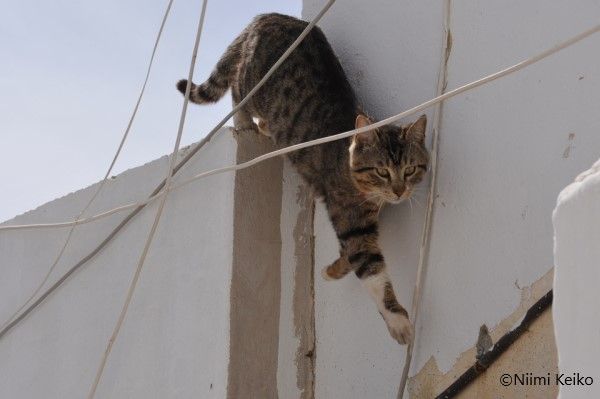 さらに路地を歩いていると、迷路のようになっていて、白い壁が立ちふさがりました。この先へ進めるのか? と立ち止まったら、かわいい顔をしたオス猫が現れました。「トラくん、この先へ進めるの?」と聞いてみました。