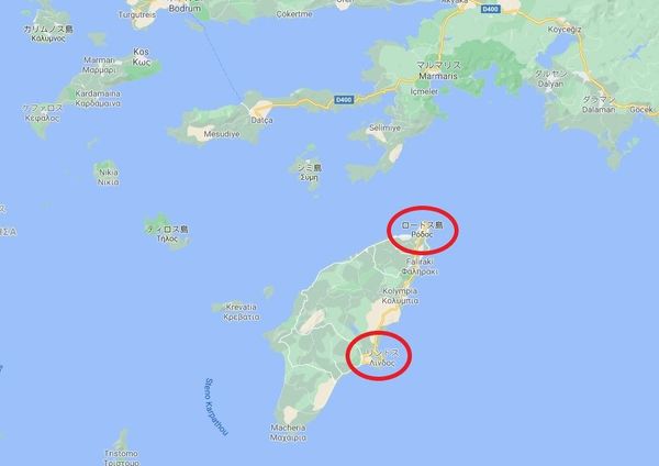 ロドス島北端にロドス旧市街がある。海岸沿いに南西にいったところがリンドス。左上に同じドデカネス諸島のコス島とカリムノス島がある。右上の陸地はトルコ(Googleマップ)拡大画像表示