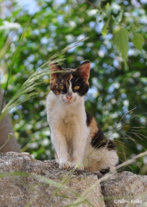 気配を感じて振り向けば、ミケ柄の幼猫も海を眺めていました。