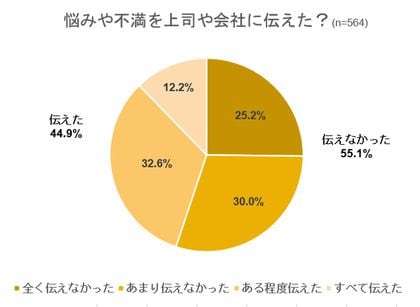 復職後の悩みを抱える一方で「悩みや不満を上司や会社に伝えたか」を聞くと、「伝えなかった」が55.1%で過半数を占め、さらに4人に1人は「全く伝えていない」と回答。伝えなかった理由として最も多かったのは「子育て中である事情を考えると我慢すべきものだと思った」で、4割にものぼった。公私混同を気にして、悩みを抱えがちなケースも少なくないと予想できる。