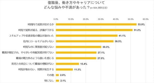 続いて、「復職後の働き方やキャリアについての悩みや不満」を尋ねた。その結果、最も多かったのは「時間内で成果が出せるか」で53.9%、次いで「時短で給料や評価が下がる」が51.2%、「スキルアップや昇進昇格の機会が遠のいた」が41.1%など、自身の能力と成果を不安視する悩みが中心となった。また「時短なのに業務量が減らない」は30.3%と、3人に1人が感じており、制度と勤務の実態にギャップもあるようだ。