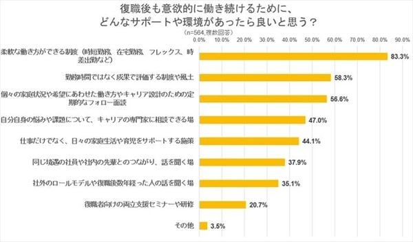次に、「復職後も意欲的に働くためにあったらいいと思うサポートや環境」について尋ねると、「柔軟な働き方ができる制度」(83.3%)が8割以上に。以下、「勤務時間でなく成果で評価する制度や風土」(58.3%)、「家庭状況や希望にあわせた働き方やキャリア設計のための定期的なフォロー」(56.6%)、「自分の悩みや課題についてキャリアの専門家に相談できる場」(47%)などと続いた。制度による画一的な支援だけでなく、個々の状況に寄り添ったフォローや相談の場を希望している様子がうかがえる。