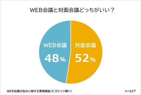 新型コロナウイルス感染症拡大による外出自粛を機に、WEB会議が急速に普及した今、ビジネスパーソンはWEB会議をどのように感じているのだろうか。はじめに、「WEB会議と対面会議ではどちらを好むか」を聞いた。すると、「対面会議」が52%、「WEB会議」が48%という結果に。僅差だが、対面会議を好む人が多かった。