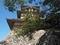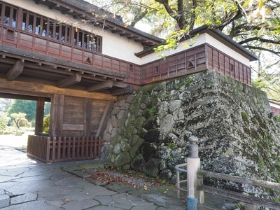 写真4:「冠木門」の名がある本丸の正門。門・塀ともに復元だが、横矢掛りが再現されている。