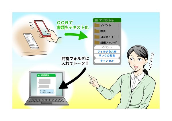 緑山:ふぅ...。経理に提出する書類データはこんな感じでいいかしら。えっと、ファイルは、 LINE WORKSの共有フォルダ にアップロードして。