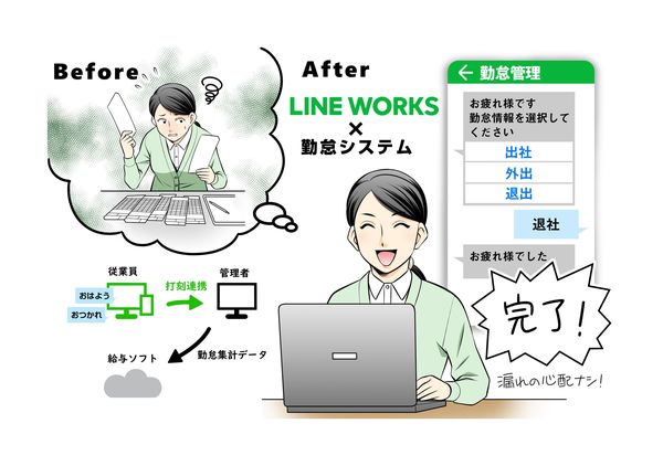 緑山:それにしても、LINE WORKSのチャットと勤怠システムの連携で現場や営業社員の打刻漏れがぐっと減ったわね。それに勤怠システムが自動集計した勤怠データが給与計算システムとも連携しているから、給与計算も自動でやってくれるし...。