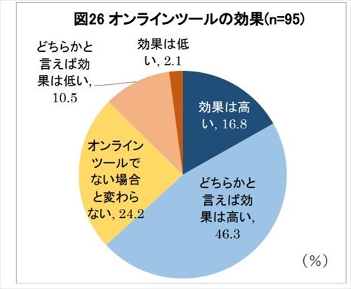 今回の調査では、Off-JTに関する設問で受講者の6割以上が「オンラインツールを活用した」ことが判明している。そこで、Off-JTあるいは自己啓発でオンラインツールを利用した回答者に、その効果を評価してもらった。その結果、「効果は高い」(16.8%)と「どちらかと言えば効果は高い」(46.3%)と、合計63.1%がオンラインツールの効果を実感していることがわかった。「効果は低い」(2.1%)や、「どちらかと言えば効果は低い」(10.5%)とする評価は約1割にとどまることからも、今後、教育の場においてオンラインツールの普及はさらに加速することが予想される。