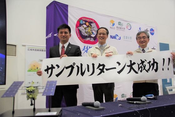 「はやぶさ2」のサンプルリターン成功を喜ぶプロジェクトメンバー(左から臼井寛裕JAXA宇宙科学研究所地球外物質研究グループ長、津田雄一はやぶさ2プロジェクトマネジャー、吉川真はやぶさ2ミッションマネジャー)。12月8日の記者会見にて。