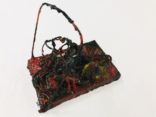 木材に針金をつけ、そこに細い針金をぐるぐる巻にする。絵の具チューブがら直接絵の具をたらす・・・。