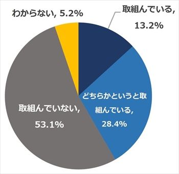 また、「現在所属している会社は、発注や請求業務のペーパーレス化(電子化)に取り組んでいるか」という質問では、「取り組んでいる」が41.6%(取り組んでいる:13.2%、どちらかというと取り組んでいる:28.4%)、「取り組んでいない」が53.1%となった。約4割の企業で何らかの取り組みが始まっているものの、いまだ取り組みを実施していない企業も半数以上にのぼるようだ。