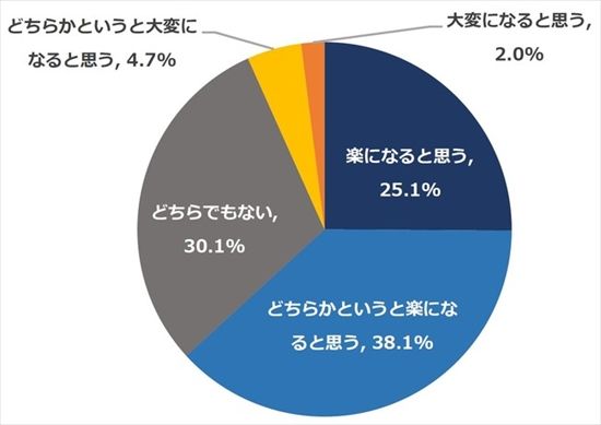 最後に、「ペーパーレス化(電子化)により発注請求業務が楽になると思うか」と尋ねたところ、「楽になる」が63.2%(楽になる:25.1%、どちらかというと楽になる:38.1%)にのぼり、「大変になる」の6.7%(大変になる:2%、どちらかというと大変になる:4.7%)を大きく上回る結果となった。