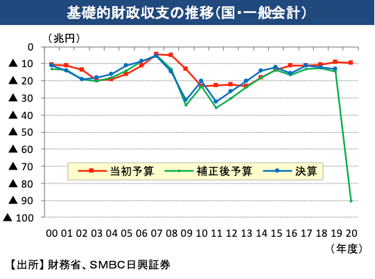 コロナ禍に対応するため、政府は2020年度中、3度にわたって巨額の経済対策を盛り込んだ補正予算を編成しました。その結果、2020年度の国・一般会計の基礎的財政収支(プライマリーバランス)の赤字額は90.4兆円へ達しました。